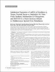 BACKGROUND: The mechanisms of immunity to Rickettsia conorii that have been elucidated in mouse models have not been evaluated in human tissues. METHODS: In this study, quantitative real-time polymerase chain reaction was used to determine the levels of expression of inflammatory and immune mediators in skin-biopsy samples collected from 23 untreated patients with Mediterranean spotted fever (MSF). RESULTS: In all 23 patients, the levels of intralesional expression of mRNA of tumor necrosis factor (TNF)- alpha , interferon (IFN)- gamma , interleukin (IL)-10, RANTES, and indoleamine-2,3-dioxygenase (IDO), an enzyme involved in limiting rickettsial growth by tryptopha degradation, were higher than those in control subjects; 6 of the 23 patients had high levels of inducible nitric oxide synthase (iNOS), a source of microbicidal nitric oxide. Positive correlations between TNF- alpha , IFN- gamma , iNOS, IDO, and mild/moderate MSF suggest that type 1 polarization plays a protective role. Significantly higher levels of intralesional expression of IL-10 mRNA were inversely correlated with levels of intralesional expression of IFN- gamma mRNA and TNF- alpha mRNA. The mRNA-expression level of the chemokine RANTES was significantly higher in patients with severe MSF. CONCLUSION: Mild/moderate MSF is associated with a strong and balanced intralesional proinflammatory and anti-inflammatory response, with a dominant type 1 immunity, whereas severe MSF is associated with increased expression of chemokine mRNA. Whether these factors are simply correlates of mild and severe MSF or contribute to antirickettsial immunity and pathogenesis remains to be determined.
